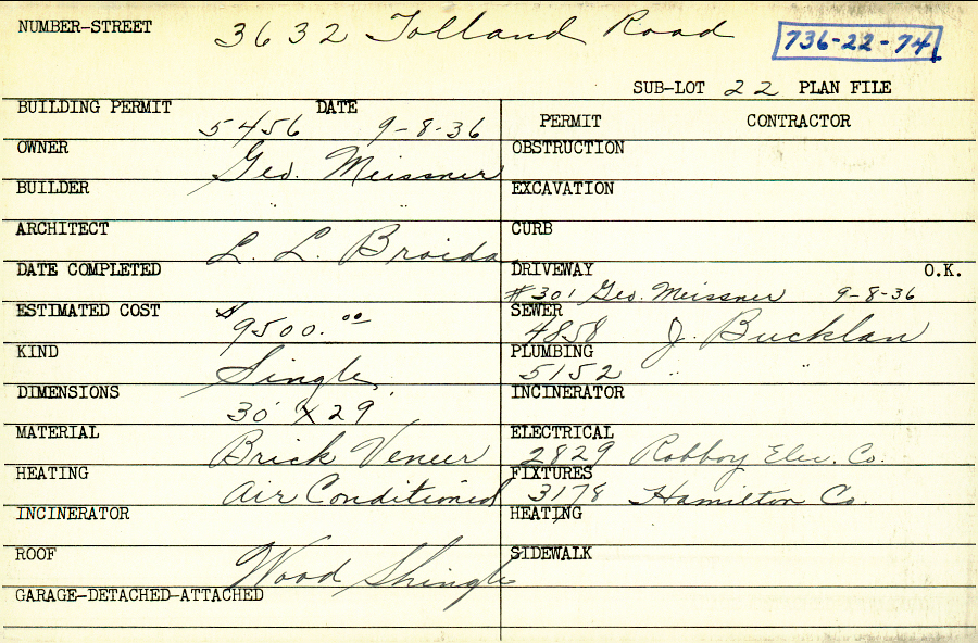 3632 Tolland Road Shaker Heights, OH 44122 PARCEL ID: 736-22-074 Building Permit Date: 09-08-1936 Plan File Number: 0 Neighborhood: Sussex Owner: Meissner, George Builder: Meissner, George Architect: Broida, L. L. Estimated Cost: 9500 Kind: Single, Single Residence or Dwelling Material: Brick Veneer Heating: Air Conditioned Roof: Wood Shingle |