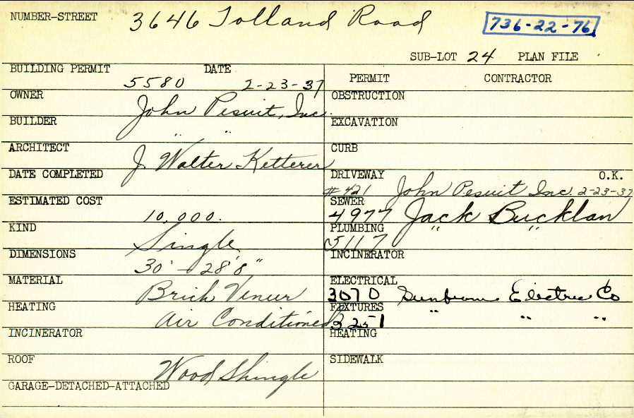 3646 Tolland Road Shaker Heights, OH 44122 PARCEL ID: 736-22-076 Building Permit Date: 02-23-1937 Plan File Number: 0 Neighborhood: Sussex Owner: John Pesuit Inc. Builder: John Pesuit Inc. Architect: Ketterer, J. Walter Estimated Cost: 10000 Kind: Single, Single Residence or Dwelling Material: Brick Veneer Heating: Air Conditioned Roof: Wood Shingle |