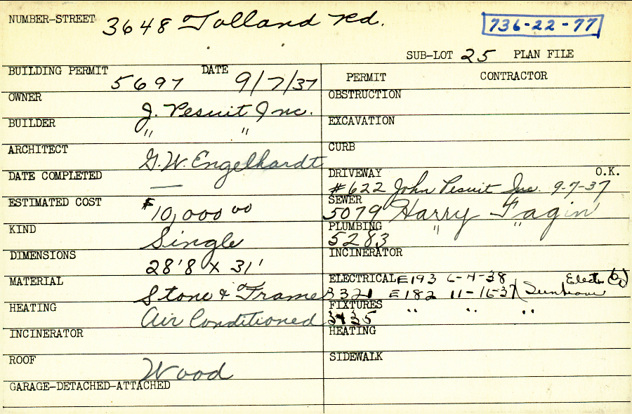 3648 Tolland Road Shaker Heights, OH 44122 PARCEL ID: 736-22-077 Building Permit Date: 09-07-1937 Plan File Number: 0 Neighborhood: Sussex Owner: J. Pesuit Inc. Builder: J. Pesuit Inc. Architect: Engelhardt, G. W. Estimated Cost: 10000 Kind: Single, Single Residence or Dwelling Material: Stone and Frame Heating: Air Conditioned Roof: Wood |