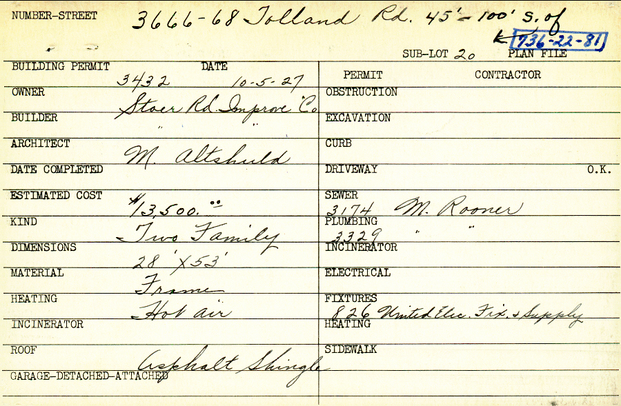 3666 Tolland Road Shaker Heights, OH 44122 PARCEL ID: 736-22-081 Building Permit Date: 10-05-1927 Plan File Number: 5917 Microfilm Roll: Roll#80 Neighborhood: Sussex Owner: Stoer Road Improvement Company Builder: Stoer Road Improvement Company Architect: Altshuld, M. Estimated Cost: 13500 Kind: Duplex or Two-Family Material: Frame Heating: Hot Air Roof: Asphalt Shingles |