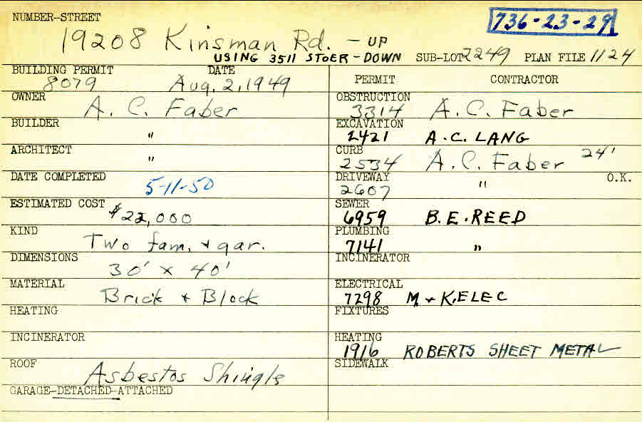 19208 Chagrin Boulevard Shaker Heights, OH 44122 PARCEL ID: 736-23-029 Building Permit Date: 08-02-1949 Plan File Number: 1124 scanned, 6380 Microfilm Roll: Roll013, Roll#85 Neighborhood: Sussex Owner: Faber, A. C. Builder: Faber, A. C. Architect: Faber, A. C. Estimated Cost: 22000 Date Completed: 05-11-1950 Kind: Duplex or Two-Family and Garage Material: Brick and Block Roof: Asbestos Shingles Garage: detached |