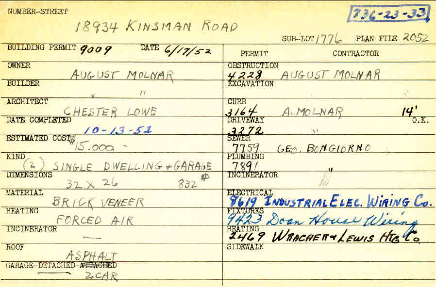 18934 Chagrin Boulevard Shaker Heights, OH 44122 PARCEL ID: 736-23-033 Building Permit Date: 06-17-1952 Plan File Number: 2052 Microfilm Roll: Roll#31 Neighborhood: Sussex Owner: Molnar, August Builder: Molnar, August Architect: Lowe, Chester Estimated Cost: 15000 Date Completed: 10-13-1952 Kind: Single Dwelling and Garage Material: Brick Veneer Heating: Forced Air Roof: Asphalt Garage: detached 2 car |