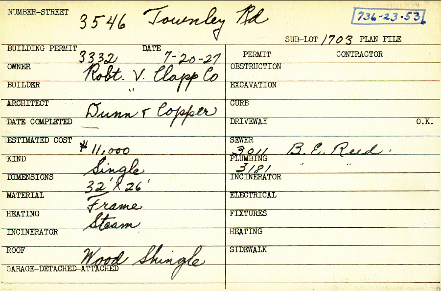 3546 Townley Road Shaker Heights, OH 44122 PARCEL ID: 736-23-053 Building Permit Date: 07-20-1927 Plan File Number: 332 all scanned Microfilm Roll: Roll004 Neighborhood: Sussex Owner: Robert V. Clapp Company Builder: Robert V. Clapp Company Architect: Dunn and Copper Estimated Cost: 11000 Kind: Single, Single Residence or Dwelling Material: Frame Heating: Steam Roof: Wood Shingle |