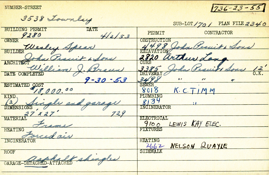 3538 Townley Road Shaker Heights, OH 44122 PARCEL ID: 736-23-055 Building Permit Date: 04-02-1953 Plan File Number: 2340 Neighborhood: Sussex Owner: Spear, Wesley Builder: John Pesuit and Sons Architect: Braun, William J. Estimated Cost: 18000 Date Completed: 09-30-1953 Kind: Single Dwelling and Garage (2) Material: Frame Heating: Forced Air Roof: Asphalt Shingles Garage: detached |