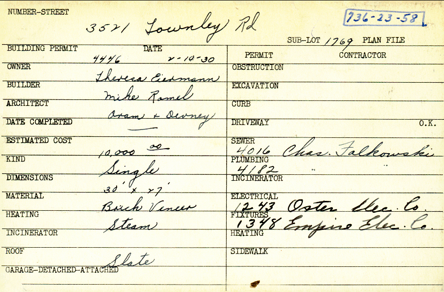 3521 Townley Road Shaker Heights, OH 44122 PARCEL ID: 736-23-058 Building Permit Date: 02-10-1930 Plan File Number: 0 Neighborhood: Sussex Owner: Eiermann, Theresa Builder: Ramel, Mike Architect: Oram and Devney Estimated Cost: 10000 Kind: Single, Single Residence or Dwelling Material: Brick Veneer Heating: Steam Roof: Slate |