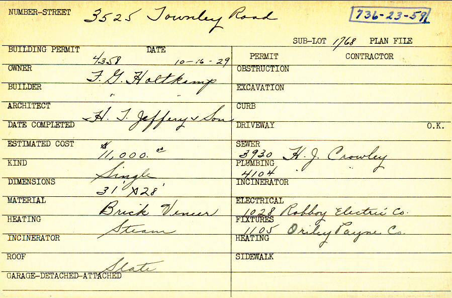 3525 Townley Road Shaker Heights, OH 44122 PARCEL ID: 736-23-059 Building Permit Date: 10-16-1929 Plan File Number: 0 Neighborhood: Sussex Owner: Holtkamp, F. G. Builder: Holtkamp, F. G. Architect: H. T. Jeffery and Sons Estimated Cost: 11000 Kind: Single, Single Residence or Dwelling Material: Brick Veneer Heating: Steam Roof: Slate |