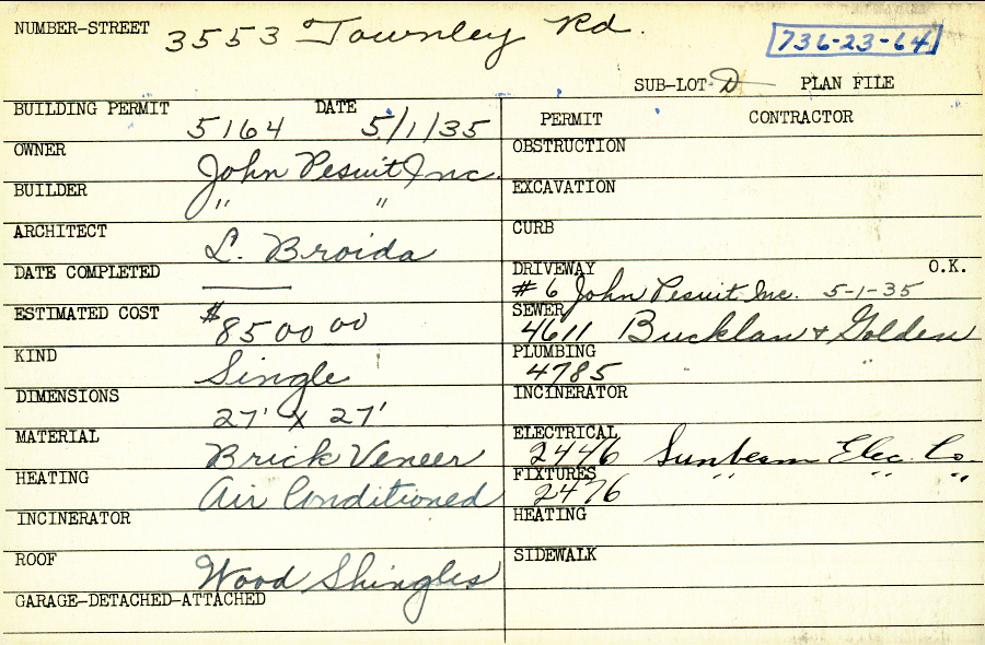 3553 Townley Road Shaker Heights, OH 44122 PARCEL ID: 736-23-064 Building Permit Date: 05-01-1935 Plan File Number: 0 Neighborhood: Sussex Owner: John Pesuit Inc. Builder: John Pesuit Inc. Architect: Broida, L. Estimated Cost: 8500 Kind: Single, Single Residence or Dwelling Material: Brick Veneer Heating: Air Conditioned Roof: Wood Shingle |