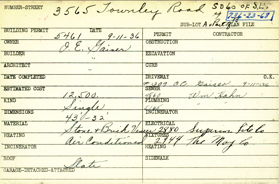 3565 Townley Road Shaker Heights, OH 44122 PARCEL ID: 736-23-068 Building Permit Date: 09-11-1936 Plan File Number: 0 Neighborhood: Sussex Owner: Gaiser, O. E. Builder: Gaiser, O. E. Architect: Gaiser, O. E. Estimated Cost: 12500 Kind: Single, Single Residence or Dwelling Material: Stone and Brick Veneer Heating: Air Conditioned Roof: Slate |