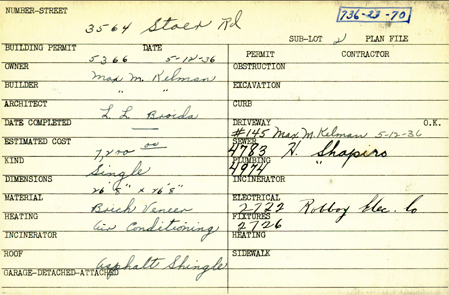 3564 Stoer Road Shaker Heights, OH 44122 PARCEL ID: 736-23-070 Building Permit Date: 05-12-1936 Plan File Number: 0 Neighborhood: Sussex Owner: Kelman, Max M. Builder: Kelman, Max M. Architect: Broida, L. L. Estimated Cost: 7200 Kind: Single, Single Residence or Dwelling Material: Brick Veneer Heating: Air Conditioned Roof: Asphalt Shingles Card Available: yes |