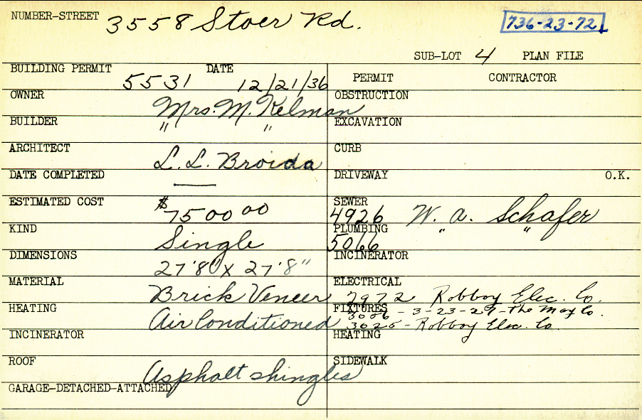 3558 Stoer Road Shaker Heights, OH 44122 PARCEL ID: 736-23-072 Building Permit Date: 12-21-1936 Plan File Number: 5513 Microfilm Roll: Roll#75 Neighborhood: Sussex Owner: Kelman, Mrs. M. Builder: Kelman, Mrs. M. Architect: Broida, L. L. Estimated Cost: 7500 Kind: Single, Single Residence or Dwelling Material: Brick Veneer Heating: Air Conditioned Roof: Asphalt Shingles |