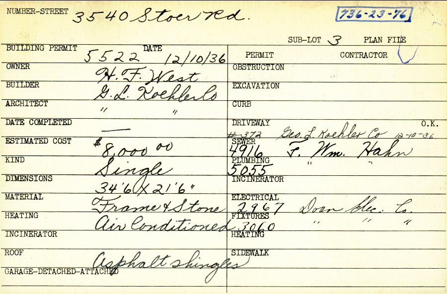 3540 Stoer Road Shaker Heights, OH 44122 PARCEL ID: 736-23-076 Building Permit Date: 12-10-1936 Plan File Number: 1636 all scanned Microfilm Roll: Roll025 Neighborhood: Sussex Owner: West, H. F. Builder: G. L. Koehler Company Architect: G. L. Koehler Company Estimated Cost: 8000 Kind: Single, Single Residence or Dwelling Material: Frame and Stone Heating: Air Conditioned Roof: Asphalt Shingles |