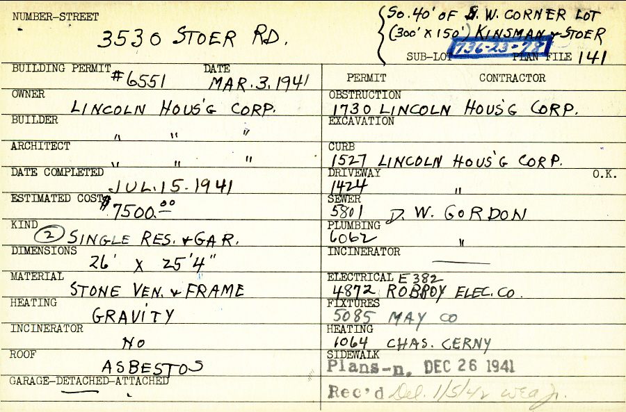 3530 Stoer Road Shaker Heights, OH 44122 PARCEL ID: 736-23-078 Building Permit Date: 03-03-1941 Plan File Number: 141, 12905 Microfilm Roll: NewRoll#18 Neighborhood: Sussex Owner: Lincoln Housing Corporation Builder: Lincoln Housing Corporation Architect: Lincoln Housing Corporation Estimated Cost: 7500 Date Completed: 07-15-1941 Kind: Single Dwelling and Garage (2) Material: Stone Veneer and Frame Heating: Gravity System Roof: Asbestos Garage: detached |