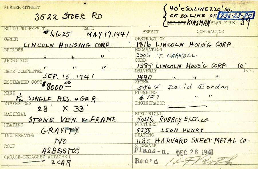 3522 Stoer Road Shaker Heights, OH 44122 PARCEL ID: 736-23-080 Building Permit Date: 05-17-1941 Plan File Number: 39, 3995 Microfilm Roll: Roll#58 Neighborhood: Sussex Owner: Lincoln Housing Corporation Builder: Lincoln Housing Corporation Architect: Lincoln Housing Corporation Estimated Cost: 8000 Date Completed: 09-15-1941 Kind: Single Dwelling and Garage Material: Stone Veneer and Frame Heating: Gravity System Roof: Asbestos Garage: detached 2 car |