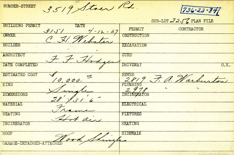 3519 Stoer Road Shaker Heights, OH 44122 PARCEL ID: 736-23-084 Building Permit Date: 04-12-1927 Plan File Number: 0 Neighborhood: Sussex Owner: Webster, C. H. Builder: Webster, C. H. Architect: Hodges, F. F. Estimated Cost: 10000 Kind: Single, Single Residence or Dwelling Material: Frame Heating: Hot Air Roof: Wood Shingle Card Available: yes |
