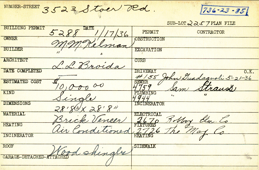 3523 Stoer Road Shaker Heights, OH 44122 PARCEL ID: 736-23-085 Building Permit Date: 01-17-1936 Plan File Number: 3123 all scanned Microfilm Roll: Roll043 Neighborhood: Sussex Owner: Kelman, M. M. Builder: Kelman, M. M. Architect: Broida, L. L. Estimated Cost: 10000 Kind: Single, Single Residence or Dwelling Material: Brick Veneer Heating: Air Conditioned Roof: Wood Shingle Blueprints: online, see link above |