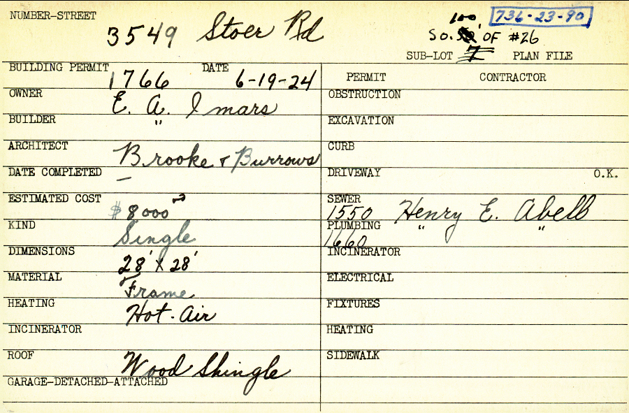 3549 Stoer Road Shaker Heights, OH 44122 PARCEL ID: 736-23-090 Building Permit Date: 06-19-1924 Plan File Number: 0 Neighborhood: Sussex Owner: Imars, E. A. Builder: Imars, E. A. Architect: Brooke and Burrows Estimated Cost: 8000 Kind: Single, Single Residence or Dwelling Material: Frame Heating: Hot Air Roof: Wood Shingle Card Available: yes |