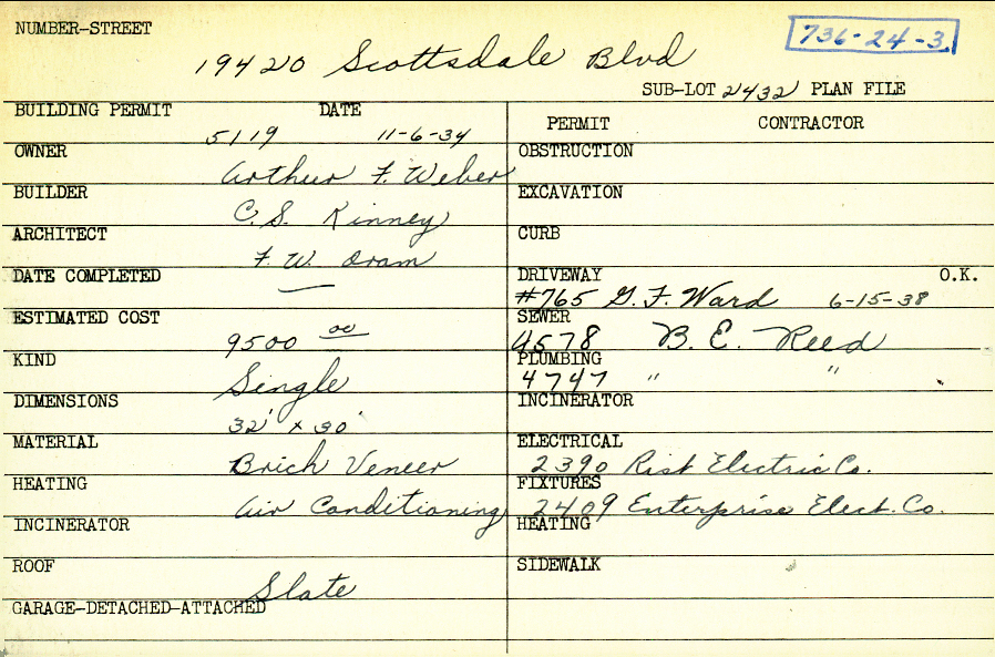 19420 Scottsdale Boulevard Shaker Heights, OH 44122 PARCEL ID: 736-24-003 Building Permit Date: 11-06-1934 Plan File Number: 0 Neighborhood: Sussex Owner: Weber, Arthur F. Builder: Kinney, C. S. Architect: Oram, F. W. Estimated Cost: 9500 Kind: Single, Single Residence or Dwelling Material: Brick Veneer Heating: Air Conditioned Roof: Slate Card Available: yes |