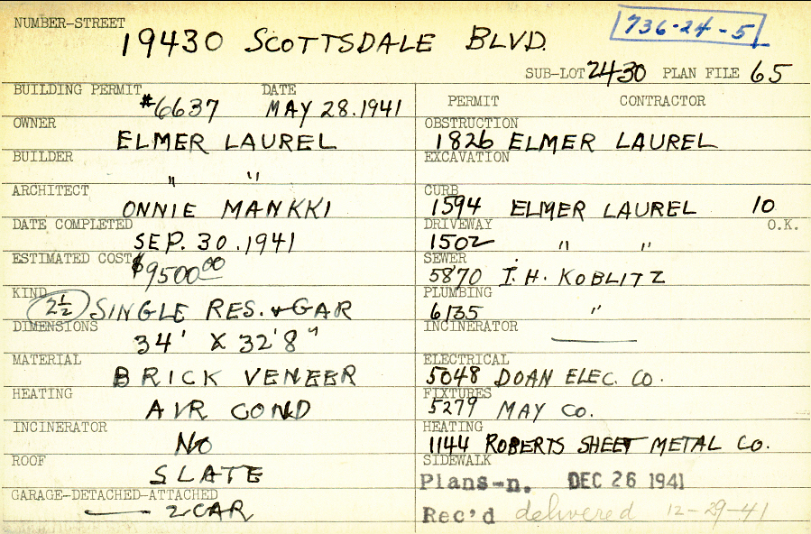 19430 Scottsdale Boulevard Shaker Heights, OH 44122 PARCEL ID: 736-24-005 Building Permit Date: 05-28-1941 Plan File Number: 1156 all scanned Microfilm Roll: Roll014 Neighborhood: Sussex Owner: Laurel, Elmer Builder: Laurel, Elmer Architect: Mankki, Onnie Estimated Cost: 9500 Date Completed: 09-30-1941 Kind: Single 2-1/2 Material: Brick Veneer Heating: Air Conditioned Roof: Slate Garage: detached 2 car |