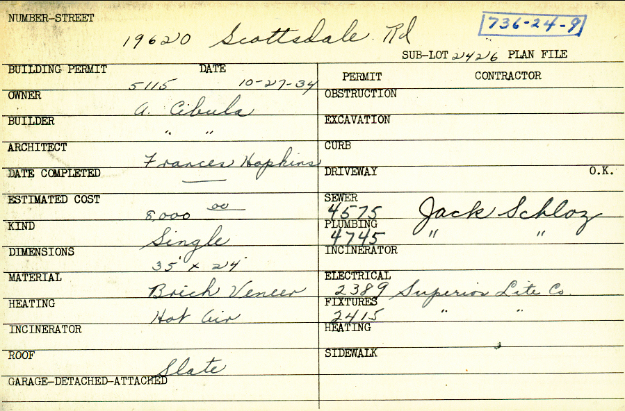 19620 Scottsdale Boulevard Shaker Heights, OH 44122 PARCEL ID: 736-24-009 Building Permit Date: 10-27-1934 Plan File Number: 0 Neighborhood: Sussex Owner: Cibula, A. Builder: Cibula, A. Architect: Hopkins, Frances Estimated Cost: 8000 Kind: Single, Single Residence or Dwelling Material: Brick Veneer Heating: Hot Air Roof: Slate Card Available: yes |