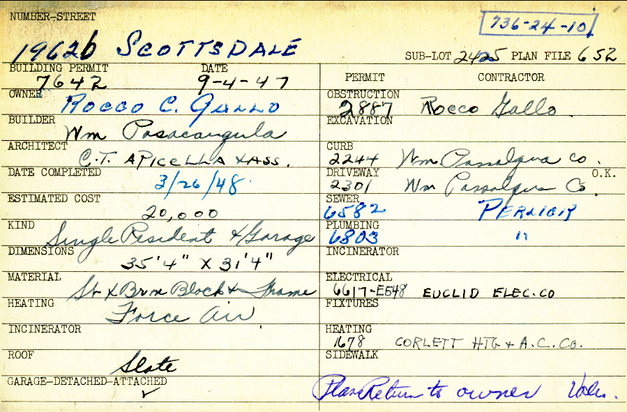 19626 Scottsdale Boulevard Shaker Heights, OH 44122 PARCEL ID: 736-24-010 Building Permit Date: 09-04-1947 Plan File Number: 652 all scanned Microfilm Roll: Roll008 Neighborhood: Sussex Owner: Gallo, Rocco C. Builder: Pasacargula, William Architect: C. T. Apicella and Associates Estimated Cost: 20000 Date Completed: 03-26-1948 Kind: Single Dwelling and Garage Material: Stone and Block and Frame Heating: Forced Air Roof: Slate Garage: attached |