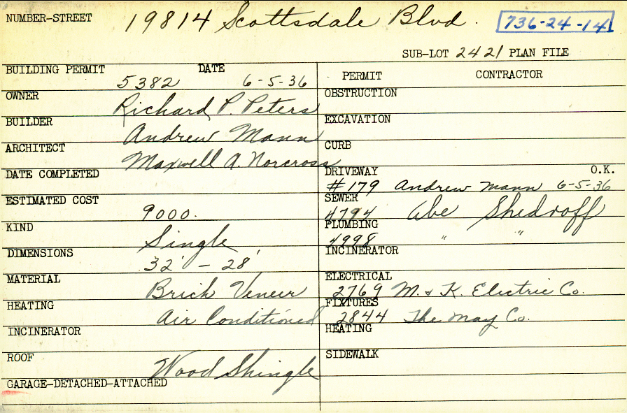 19814 Scottsdale Boulevard Shaker Heights, OH 44122 PARCEL ID: 736-24-014 Building Permit Date: 06-05-1936 Plan File Number: 0 Neighborhood: Sussex Owner: Peters, Richard P. Builder: Mann, Andrew Architect: Norcross, Maxwell A. Estimated Cost: 9000 Kind: Single, Single Residence or Dwelling Material: Brick Veneer Heating: Air Conditioned Roof: Wood Shingle Card Available: yes |