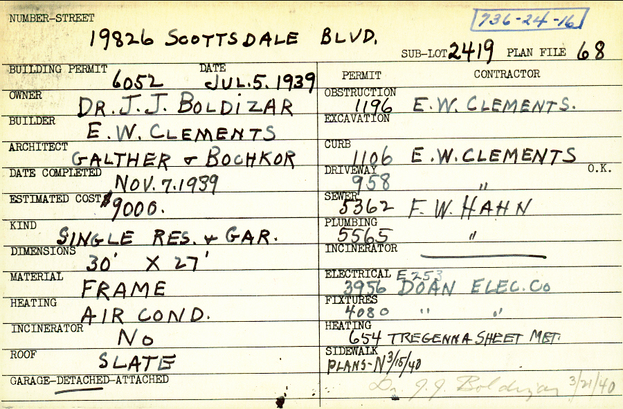 19826 Scottsdale Boulevard Shaker Heights, OH 44122 PARCEL ID: 736-24-016 Building Permit Date: 07-05-1939 Plan File Number: 68 Neighborhood: Sussex Owner: Boldizar, Dr. J. J. Builder: Clements, E. W. Architect: Galther and Bochkor Estimated Cost: 9000 Date Completed: 11-07-1939 Kind: Single Dwelling and Garage Material: Frame Heating: Air Conditioned Roof: Slate Garage: detached Card Available: yes |
