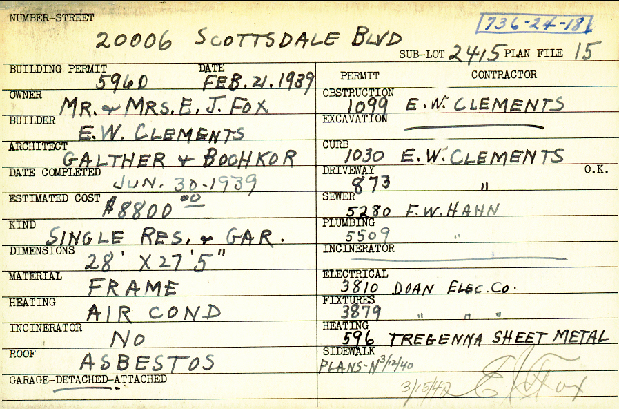20006 Scottsdale Boulevard Shaker Heights, OH 44122 PARCEL ID: 736-24-018 Building Permit Date: 02-21-1939 Plan File Number: 15 Neighborhood: Sussex Owner: Fox, Mr. and Mrs. E. J. Builder: Clements, E. W. Architect: Galther and Bochkor Estimated Cost: 8800 Date Completed: 06-30-1939 Kind: Single Dwelling and Garage Material: Frame Heating: Air Conditioned Roof: Asbestos Garage: detached |
