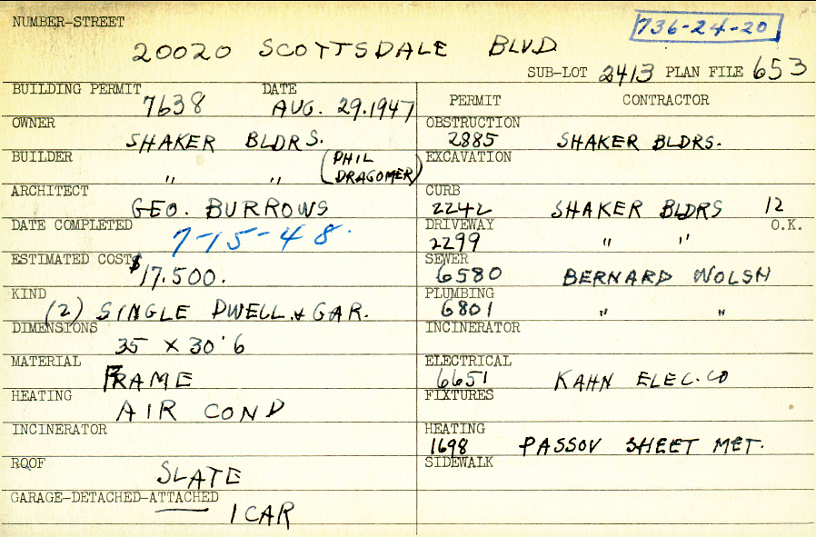 20020 Scottsdale Boulevard Shaker Heights, OH 44122 PARCEL ID: 736-24-020 Building Permit Date: 08-29-1947 Plan File Number: 653 scanned, 11976 Microfilm Roll: Roll008, NewRoll#10 Neighborhood: Sussex Owner: Shaker Builders Builder: Shaker Builders (Phil Dragomer) Architect: Burrows, George Estimated Cost: 17500 Date Completed: 07-15-1948 Kind: Single Dwelling and Garage (2) Material: Frame Heating: Air Conditioned Roof: Slate Garage: attached |