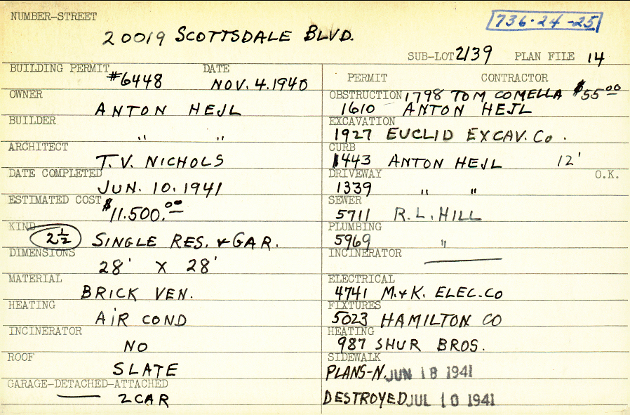 20019 Scottsdale Boulevard Shaker Heights, OH 44122 PARCEL ID: 736-24-025 Building Permit Date: 11-04-1940 Plan File Number: 14 Neighborhood: Sussex Owner: Hejl, Anton Builder: Hejl, Anton Architect: Nichols, T. V. Estimated Cost: 11500 Date Completed: 06-10-1941 Kind: Single 2-1/2 Material: Brick Veneer Heating: Air Conditioned Roof: Slate Garage: detached 2 car Card Available: yes |