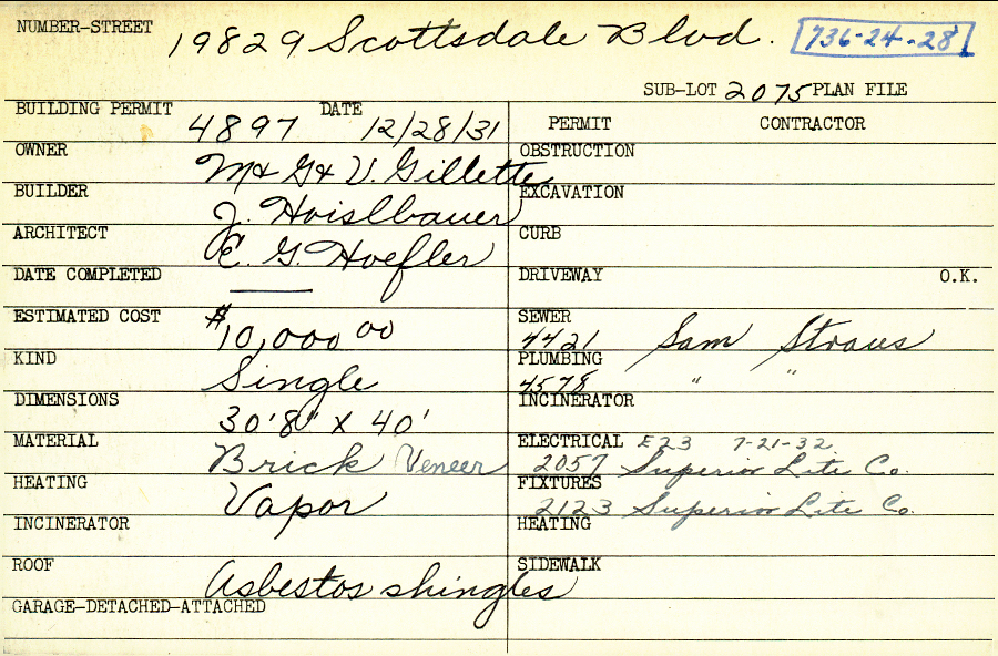19829 Scottsdale Boulevard Shaker Heights, OH 44122 PARCEL ID: 736-24-028 Building Permit Date: 12-28-1931 Plan File Number: 0 Neighborhood: Sussex Owner: M. and G. and V. Gillette Builder: Hoislbauer, J. Architect: Hoefler, E. G. Estimated Cost: 10000 Kind: Single, Single Residence or Dwelling Material: Brick Veneer Heating: Vapor Roof: Asbestos Shingles Card Available: yes |
