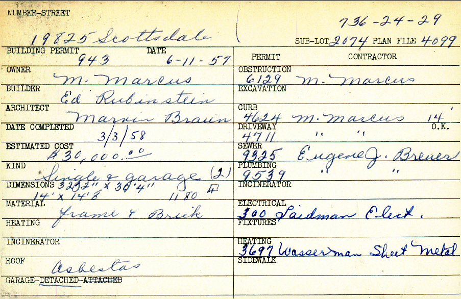 19825 Scottsdale Boulevard Shaker Heights, OH 44122 PARCEL ID: 736-24-029 Building Permit Date: 06-11-1957 Plan File Number: 4099 Microfilm Roll: Roll#59 Neighborhood: Sussex Owner: Marcus, M. Builder: Rubinstein, Ed. Architect: Braun, Marvin Estimated Cost: 30000 Date Completed: 03-03-1958 Kind: Single Dwelling and Garage (2) Material: Frame and Brick Roof: Asbestos Garage: detached |