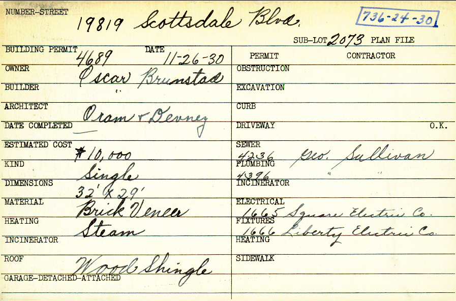 19819 Scottsdale Boulevard Shaker Heights, OH 44122 PARCEL ID: 736-24-030 Building Permit Date: 11-26-1930 Plan File Number: 0 Neighborhood: Sussex Owner: Brunstad, Oscar Builder: Brunstad, Oscar Architect: Oram and Devney Estimated Cost: 10000 Kind: Single, Single Residence or Dwelling Material: Brick Veneer Heating: Steam Roof: Wood Shingle Card Available: yes |