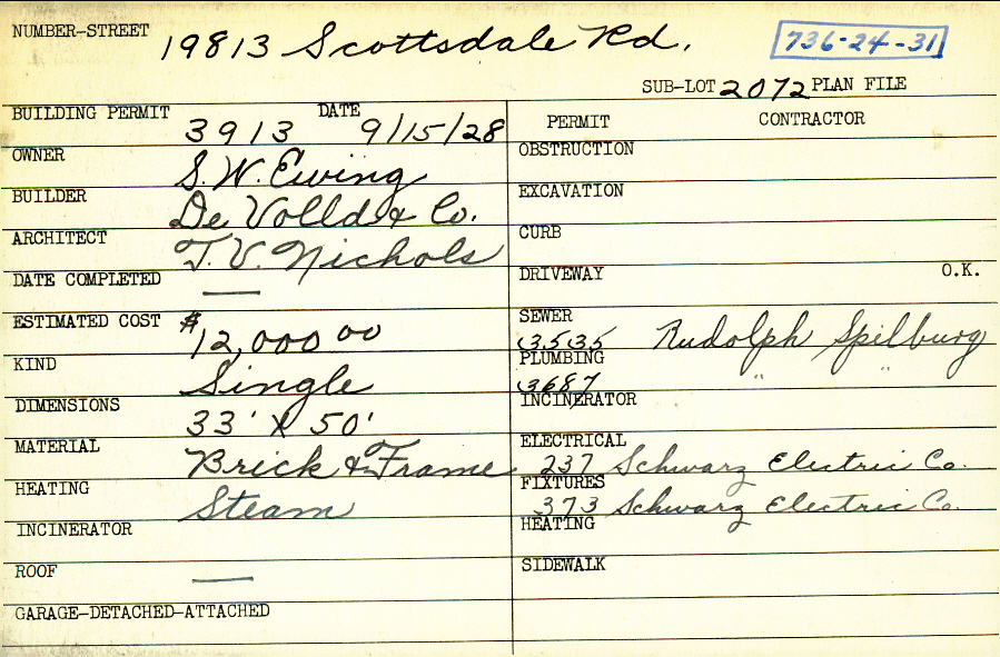 19813 Scottsdale Boulevard Shaker Heights, OH 44122 PARCEL ID: 736-24-031 Building Permit Date: 09-15-1928 Plan File Number: 0 Neighborhood: Sussex Owner: Ewing, S. W. Builder: DeVolld and Company Architect: Nichols, T. V. Estimated Cost: 12000 Kind: Single, Single Residence or Dwelling Material: Brick and Frame Heating: Steam |