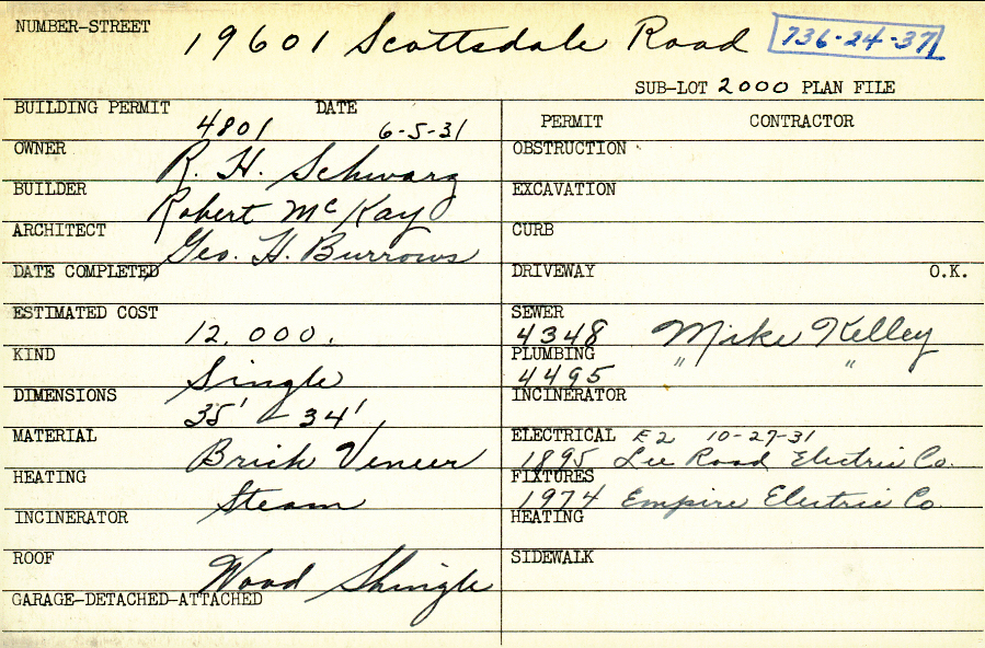 19601 Scottsdale Boulevard Shaker Heights, OH 44122 PARCEL ID: 736-24-037 Building Permit Date: 06-05-1931 Plan File Number: 0 Neighborhood: Sussex Owner: Schwarz, R. H. Builder: McKay, Robert Architect: Burrows, George H. Estimated Cost: 12000 Kind: Single, Single Residence or Dwelling Material: Brick Veneer Heating: Steam Roof: Wood Shingle Card Available: yes |