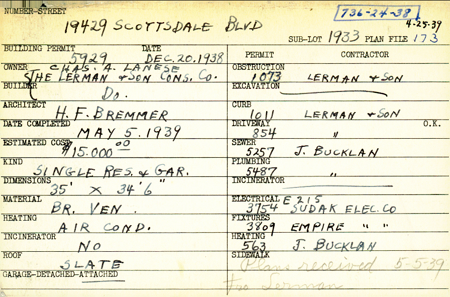 19429 Scottsdale Boulevard Shaker Heights, OH 44122 PARCEL ID: 736-24-038 Building Permit Date: 12-20-1938 Plan File Number: 1277, 1798 all scanned Microfilm Roll: Roll015, Roll027 Neighborhood: Sussex Owner: Lanese, Charles A. Builder: The Lerman and Son Construction Company Architect: Bremmer, Harry F. Estimated Cost: 15000 Date Completed: 05-05-1939 Kind: Single Dwelling and Garage Material: Brick Veneer Heating: Air Conditioned Roof: Slate Garage: attached |