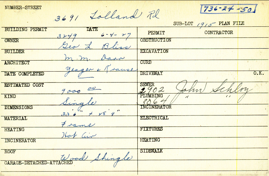 3691 Tolland Road Shaker Heights, OH 44122 PARCEL ID: 736-24-050 Building Permit Date: 06-04-1927 Plan File Number: 812 scanned, 11501 Microfilm Roll: Roll011, NewRoll#7 Neighborhood: Sussex Owner: Bliss, George L. Builder: Darr, M. M. Architect: Yeager and Krause Estimated Cost: 9000 Kind: Single, Single Residence or Dwelling Material: Frame Heating: Hot Air Roof: Wood Shingle |