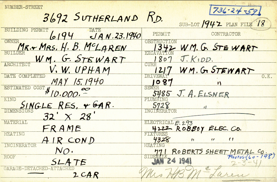 3692 Sutherland Road Shaker Heights, OH 44122 PARCEL ID: 736-24-059 Building Permit Date: 01-23-1940 Plan File Number: 18, 7681 Microfilm Roll: Roll#94 Neighborhood: Sussex Owner: McLaren, Mr. and Mrs. H. B. Builder: Stewart, William G. Architect: Upham, V. W. Estimated Cost: 10000 Date Completed: 05-15-1940 Kind: Single Dwelling and Garage Material: Frame Heating: Air Conditioned Roof: Slate Garage: detached 2 car |