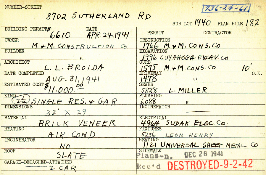 3702 Sutherland Road Shaker Heights, OH 44122 PARCEL ID: 736-24-061 Building Permit Date: 04-24-1941 Plan File Number: 182 Neighborhood: Sussex Owner: M. and M. Construction Company Builder: M. and M. Construction Company Architect: Broida, L. L. Estimated Cost: 11000 Date Completed: 08-31-1941 Kind: Single 2-1/2 Material: Brick Veneer Heating: Air Conditioned Roof: Slate Garage: detached 2 car |