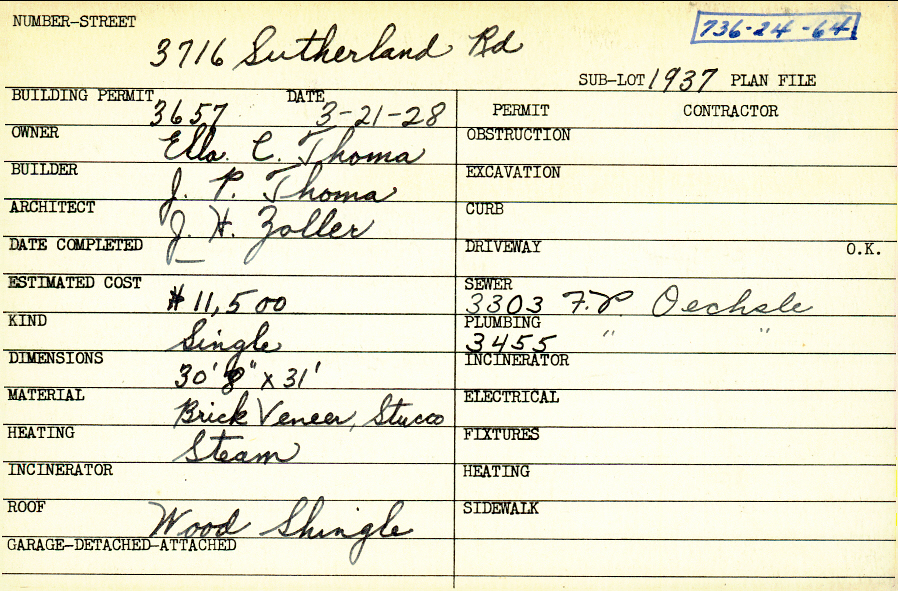 3716 Sutherland Road Shaker Heights, OH 44122 PARCEL ID: 736-24-064 Building Permit Date: 03-21-1928 Plan File Number: 7829 Microfilm Roll: Roll#94 Neighborhood: Sussex Owner: Thoma, Ella C. Builder: Thoma, J. P. Architect: Zoller, J. H. Estimated Cost: 11500 Kind: Single, Single Residence or Dwelling Material: Brick Veneer and Stucco Heating: Steam Roof: Wood Shingle |