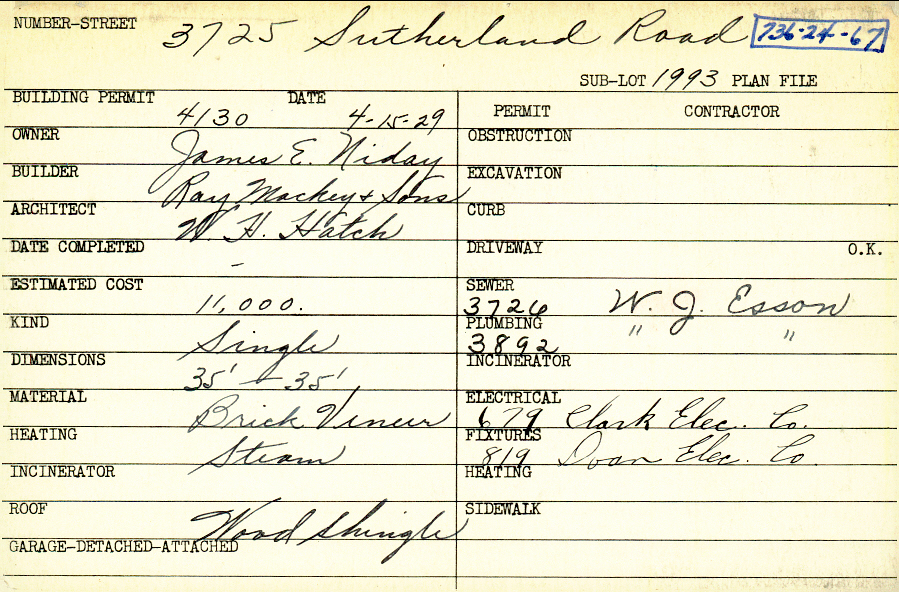 3725 Sutherland Road Shaker Heights, OH 44122 PARCEL ID: 736-24-067 Building Permit Date: 04-15-1929 Plan File Number: 0 Neighborhood: Sussex Owner: Niday, James E. Builder: Ray Mackey and Sons Architect: Hatch, W. H. Estimated Cost: 11000 Kind: Single, Single Residence or Dwelling Material: Brick Veneer Heating: Steam Roof: Wood Shingle Card Available: yes |