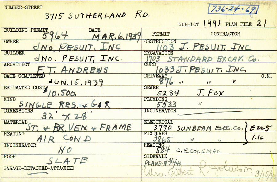 3715 Sutherland Road Shaker Heights, OH 44122 PARCEL ID: 736-24-069 Building Permit Date: 03-06-1939 Neighborhood: Sussex Owner: John Pesuit, Inc. Builder: John Pesuit, Inc. Architect: Andrews, F. T. Estimated Cost: 10500 Date Completed: 06-15-1939 Kind: Single Dwelling and Garage Material: Stone and Brick Veneer and Frame Heating: Air Conditioned Roof: Slate Garage: detached Blueprints: no blueprints on microfilm |