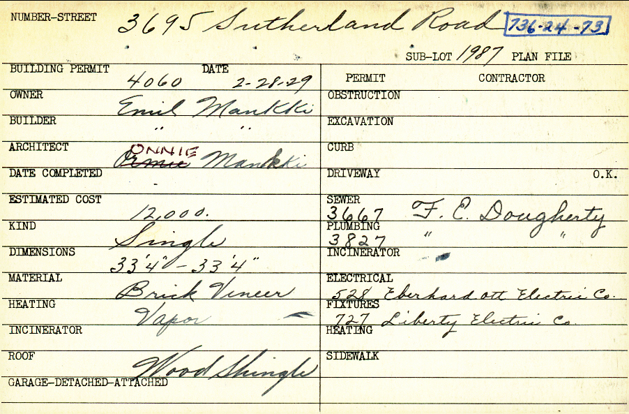 3695 Sutherland Road Shaker Heights, OH 44122 PARCEL ID: 736-24-073 Building Permit Date: 02-28-1929 Plan File Number: 1461 scanned, 6916 Microfilm Roll: Roll016, Roll#90 Neighborhood: Sussex Owner: Mankki, Emil Builder: Mankki, Emil Architect: Mankki, Onnie Estimated Cost: 12000 Kind: Single, Single Residence or Dwelling Material: Brick Veneer Heating: Vapor Roof: Wood Shingle |