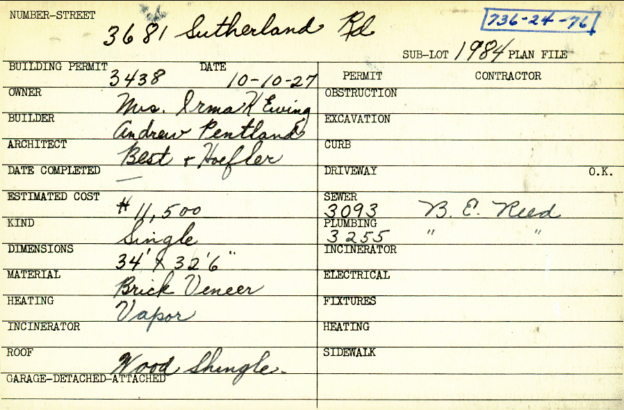 3681 Sutherland Road Shaker Heights, OH 44122 PARCEL ID: 736-24-076 Building Permit Date: 10-10-1927 Plan File Number: 0 Neighborhood: Sussex Owner: Ewing, Mrs. Irma K. Builder: Pentland, Andrew Architect: Best and Hoefler Estimated Cost: 11500 Kind: Single, Single Residence or Dwelling Material: Brick Veneer Heating: Vapor Roof: Wood Shingle Card Available: yes |