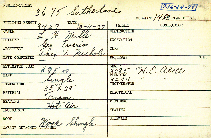 3675 Sutherland Road Shaker Heights, OH 44122 PARCEL ID: 736-24-077 Building Permit Date: 10-04-1927 Plan File Number: 10234, 12690 Microfilm Roll: NewRoll#3, NewRoll#14 Neighborhood: Sussex Owner: Mills, L. H. Builder: Everiss, George Architect: Nichols, Theodore V. Estimated Cost: 8500 Kind: Single, Single Residence or Dwelling Material: Frame Heating: Hot Air Roof: Wood Shingle |