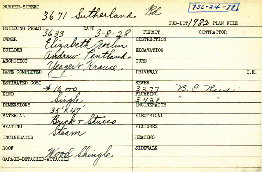 3671 Sutherland Road Shaker Heights, OH 44122 PARCEL ID: 736-24-078 Building Permit Date: 03-08-1928 Plan File Number: 0 Neighborhood: Sussex Owner: Norlin, Elizabeth Builder: Pentland, Andrew Architect: Yeager and Krause Estimated Cost: 10000 Kind: Single, Single Residence or Dwelling Material: Brick and Stucco Heating: Steam Roof: Wood Shingle Card Available: yes |