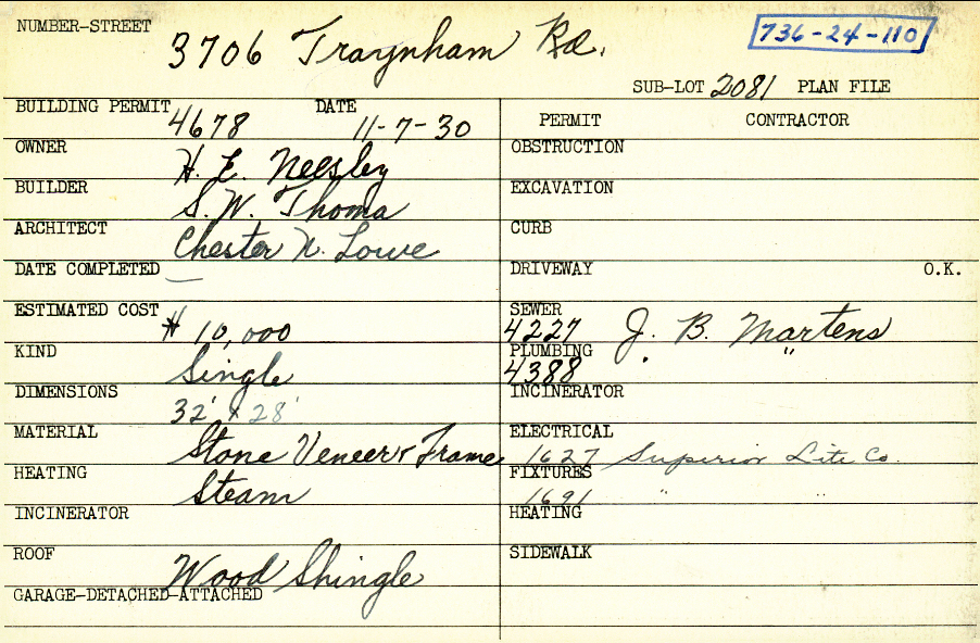 3706 Traynham Road Shaker Heights, OH 44122 PARCEL ID: 736-24-110 Building Permit Date: 11-07-1930 Plan File Number: 0 Neighborhood: Sussex Owner: Neesley, H. E. Builder: Thoma, S. W. Architect: Lowe, Chester N. Estimated Cost: 10000 Kind: Single, Single Residence or Dwelling Material: Stone Veneer and Frame Heating: Steam Roof: Wood Shingle |
