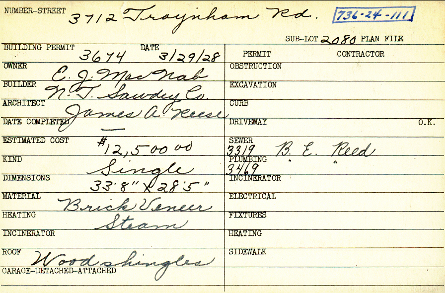 3712 Traynham Road Shaker Heights, OH 44122 PARCEL ID: 736-24-111 Building Permit Date: 03-29-1928 Plan File Number: 12743 Microfilm Roll: NewRoll#14 Neighborhood: Sussex Owner: MacNab, E. J. Builder: N. T. Sawdey Company Architect: Reese, James A. Estimated Cost: 12500 Kind: Single, Single Residence or Dwelling Material: Brick Veneer Heating: Steam Roof: Wood Shingle |
