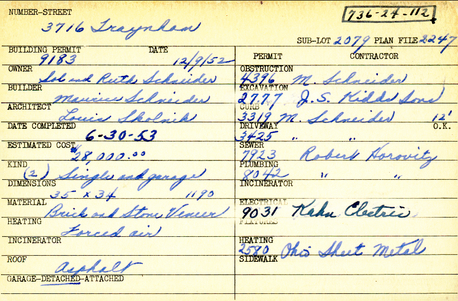 3716 Traynham Road Shaker Heights, OH 44122 PARCEL ID: 736-24-112 Building Permit Date: 12-09-1952 Plan File Number: 2247 Microfilm Roll: Roll#33 Neighborhood: Sussex Owner: Schneider, Sol and Ruth Builder: Schneider, Maurice Architect: Skolnik, Louis Estimated Cost: 28000 Date Completed: 06-30-1953 Kind: Single Dwelling and Garage (2) Material: Brick and Stone Veneer Heating: Forced Air Roof: Asphalt Garage: detached |