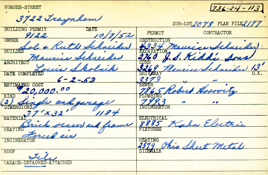 3722 Traynham Road Shaker Heights, OH 44122 PARCEL ID: 736-24-113 Building Permit Date: 10-07-1952 Plan File Number: 2177 Microfilm Roll: Roll#33 Neighborhood: Sussex Owner: Schneider, Sol and Ruth Builder: Schneider, Maurice Architect: Skolnik, Louis Estimated Cost: 20000 Date Completed: 06-02-1953 Kind: Single Dwelling and Garage (2) Material: Brick Veneer and Frame Heating: Forced Air Roof: Tile Garage: detached |