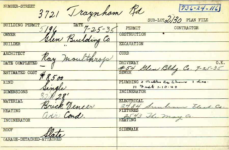 3721 Traynham Road Shaker Heights, OH 44122 PARCEL ID: 736-24-116 Building Permit Date: 07-25-1935 Plan File Number: 6286 Microfilm Roll: Roll#84 Neighborhood: Sussex Owner: Glen Building Company Builder: Glen Building Company Architect: Moulthrop, Ray Estimated Cost: 8500 Kind: Single, Single Residence or Dwelling Material: Brick Veneer Heating: Air Conditioned Roof: Slate |